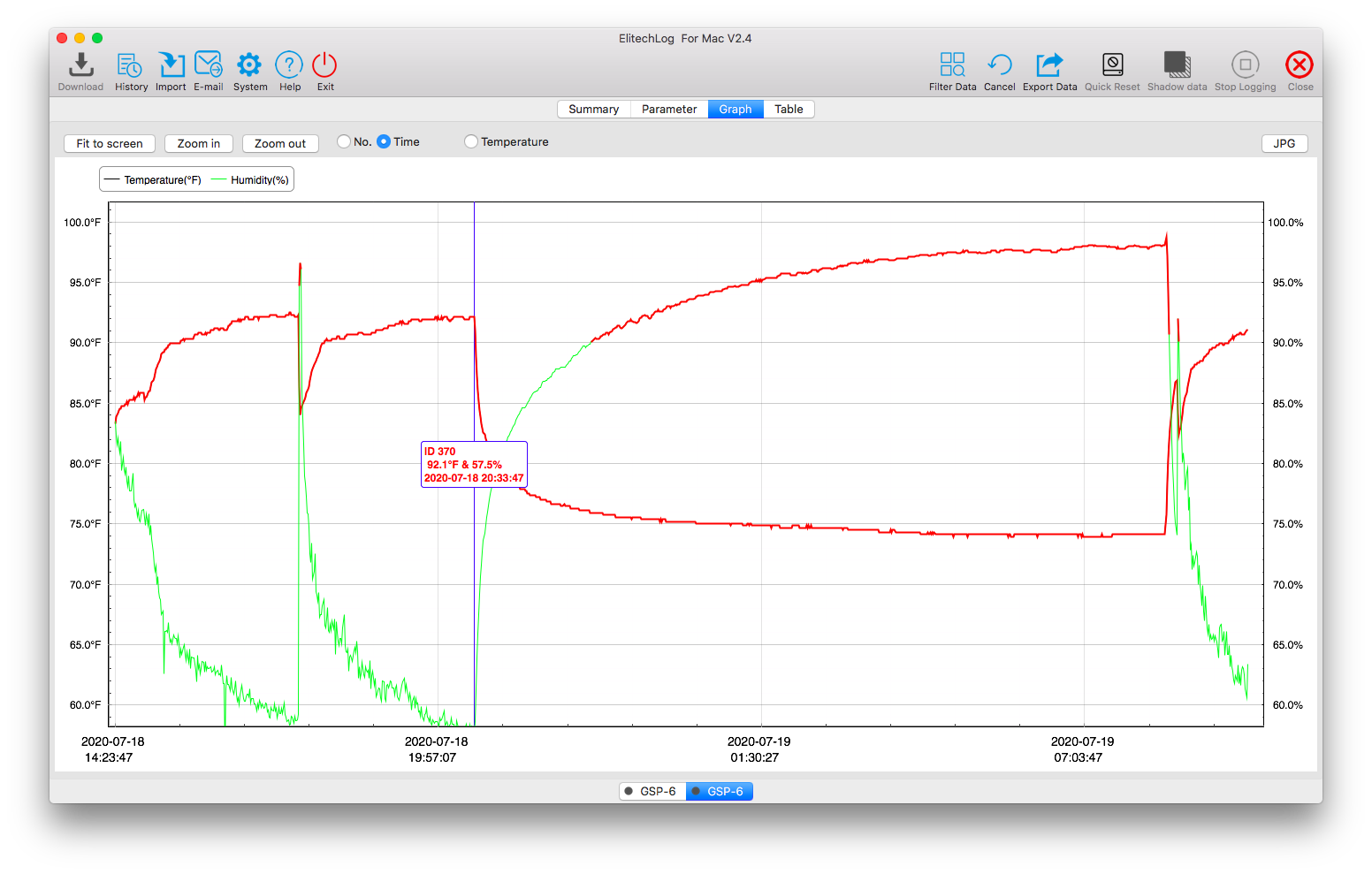 Using the single probe for temp and humidity was a bit glitchy for me so I wired both. I set them to 1 minute samples with circular logging (11 day duration, 16,000 datapoint buffer) and ran it for about a day then checked the data through their MacOS (!) app.